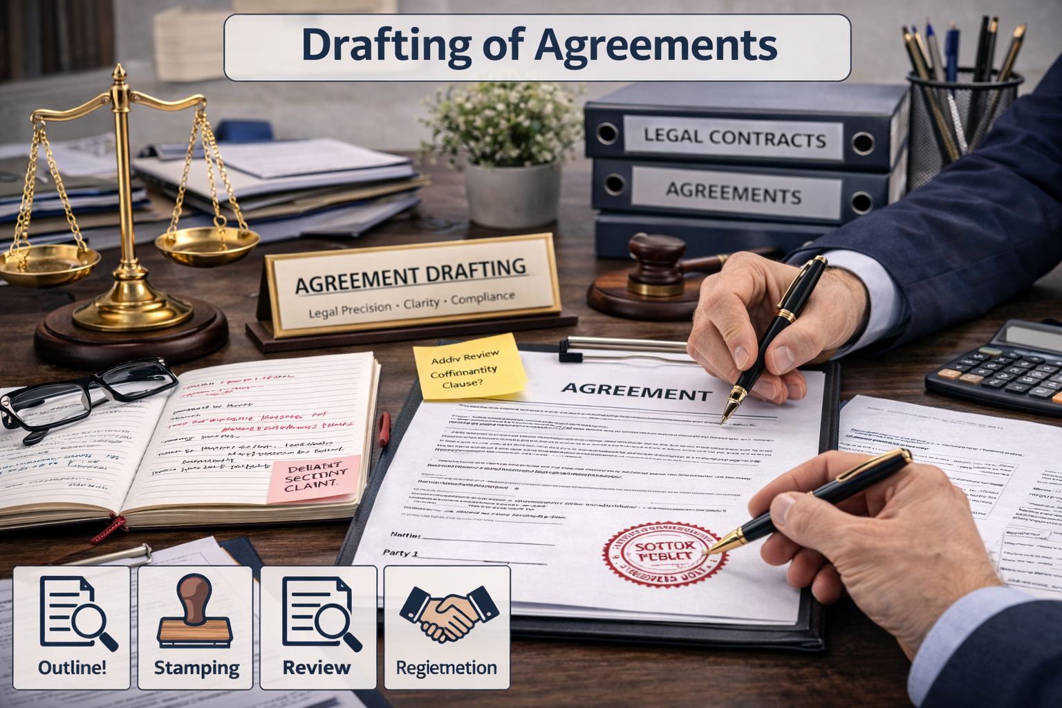 Drafting of Agreements is the process of preparing legally binding documents that define the rights, obligations, and terms between parties in a transaction. It is done in accordance with applicable laws such as the Indian Contract Act, 1872. The drafting includes clauses related to payment terms, possession, liabilities, indemnity, dispute resolution, and termination. Proper drafting ensures clarity, minimizes legal risks, and avoids future disputes. It is commonly required for agreements like Sale, Lease, Leave & License, Sub-Lease, MOU, and Deed of Assignment.