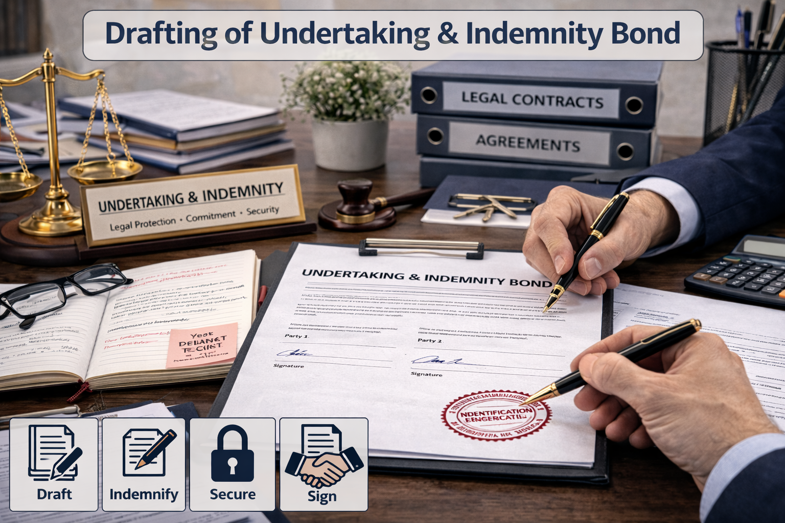 Drafting of Undertaking & Indemnity Bond involves preparing legally binding documents wherein a party formally assures compliance with certain conditions and agrees to compensate for any loss or liability arising from their actions. These documents are governed by principles of the Indian Contract Act, 1872. An Undertaking is a declaration to perform or refrain from specific acts, while an Indemnity Bond protects another party against potential losses, damages, or claims. Proper drafting clearly defines responsibilities, risk coverage, and legal obligations.