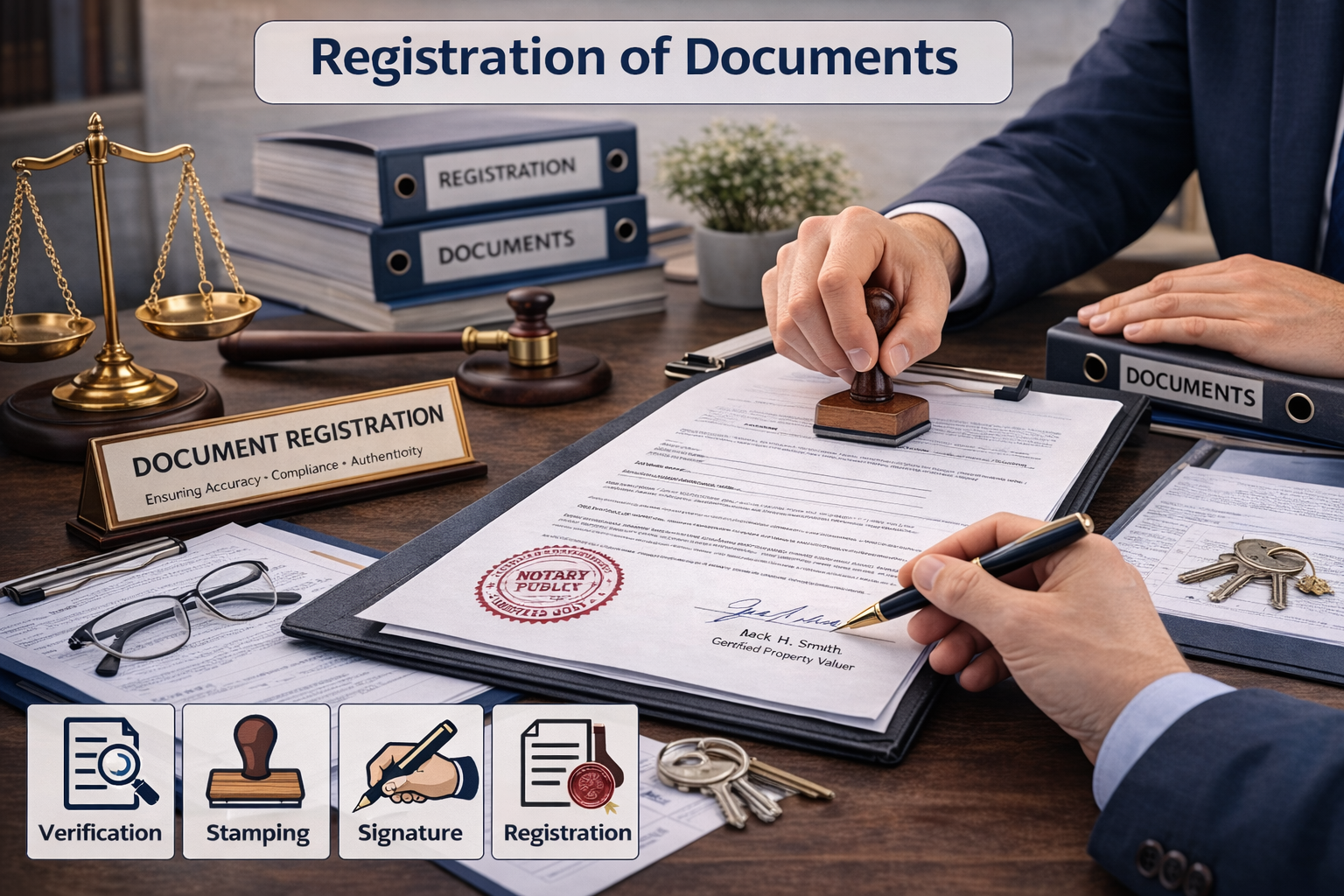 Registration of Documents is the legal process of recording property-related agreements with the office of the Sub-Registrar under the Registration Act, 1908. It gives legal validity and public notice of transactions such as Sale Deed, Lease Deed, or Deed of Assignment. The process involves payment of stamp duty, registration fees, and execution of the document in the presence of parties and witnesses. Once registered, the document becomes legally enforceable and admissible as evidence in court. Registration also helps in preventing fraud and ensuring transparency in property transactions.